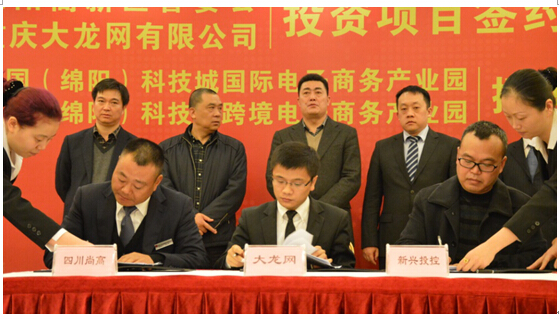 重庆大龙网科技有限公司副总经理谢秋、尚高投资股份有限公司董事长杨尚斌、新兴投资控股有限公司董事长刘士筠签订合作协议。